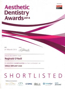 Reginald O’Neill Dental Care received shortlisting in the Aesthetic Dentistry Awards 2014 in the category of ‘Single Implant Case’.